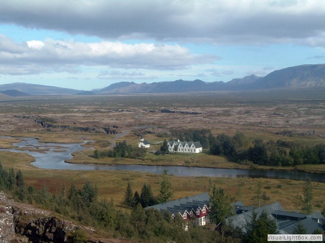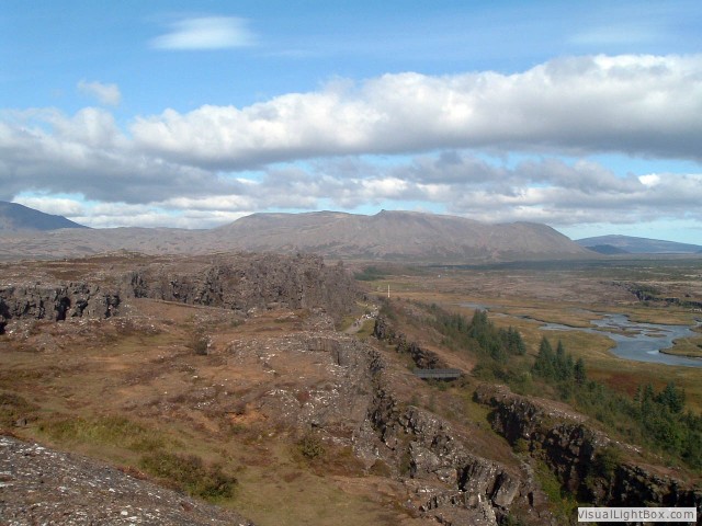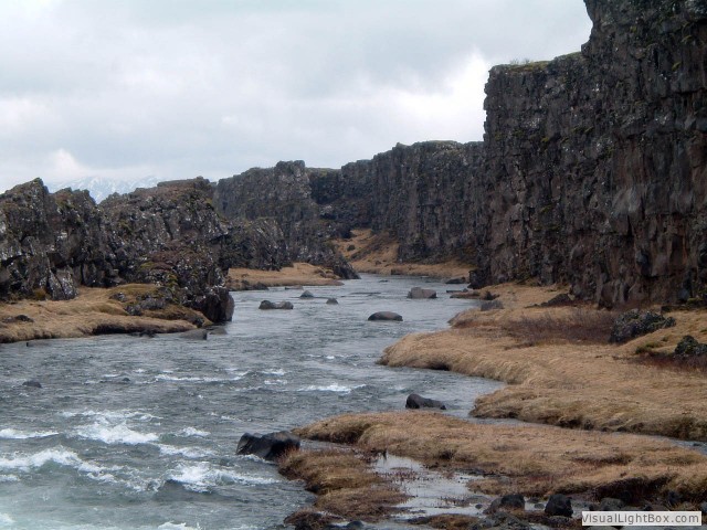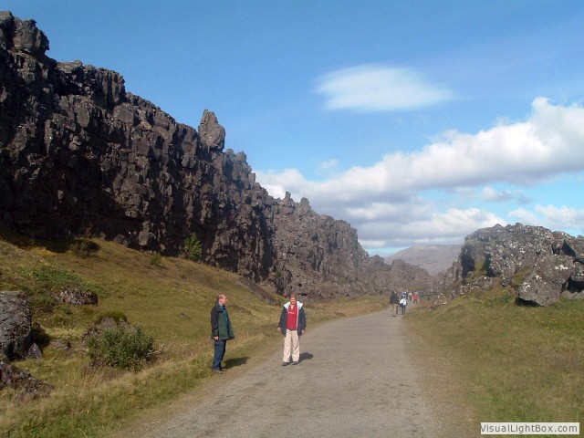 Almannagjá is 7.7 km long. Its greatest width is 64 m, and